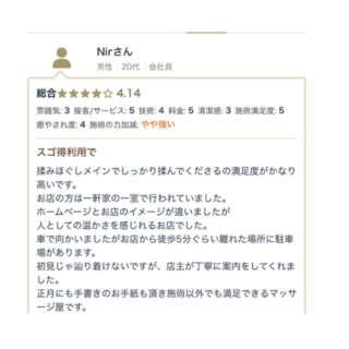 スゴ得利用で 揉みほぐしメインでしっかり揉んでくださるの満足度がかなり高いです。 お店の方は一軒家の一室で行われていました。 ホームページとお店のイメージが違いましたが 人としての...